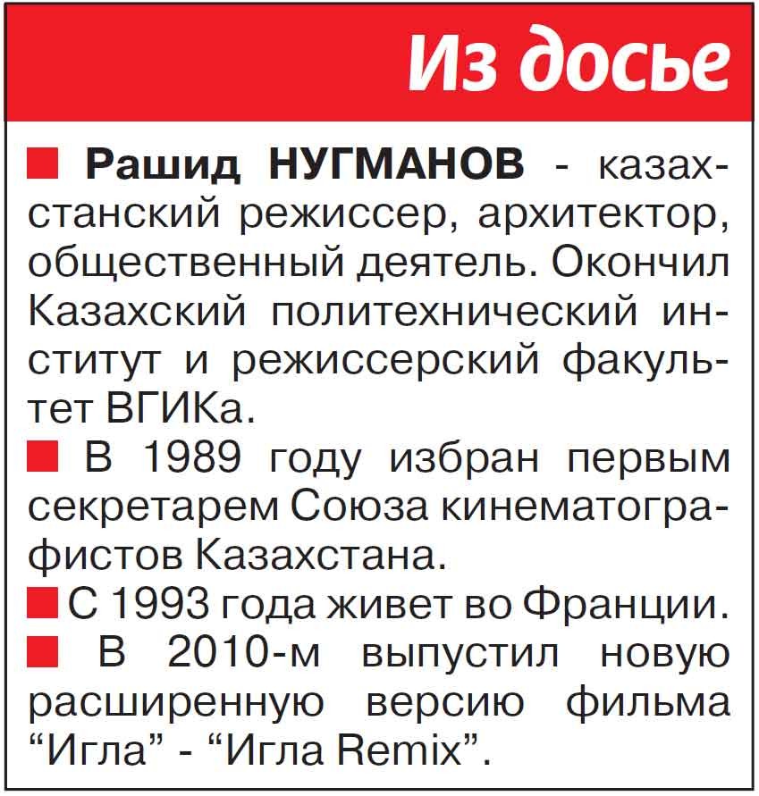 Режиссер фильма “Игла” в 2014 году был приглашен на работу в “Казахфильм” и в составе сценарной группы участвовал в разработке десятисерийного художественного фильма о Казахском ханстве. Об этой работе, о своих ближайших планах Рашид НУГМАНОВ (на снимке) рассказал газете “Время”.