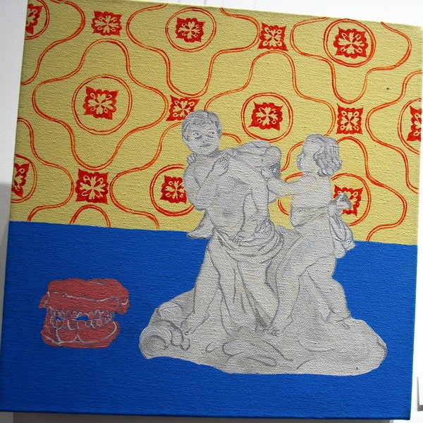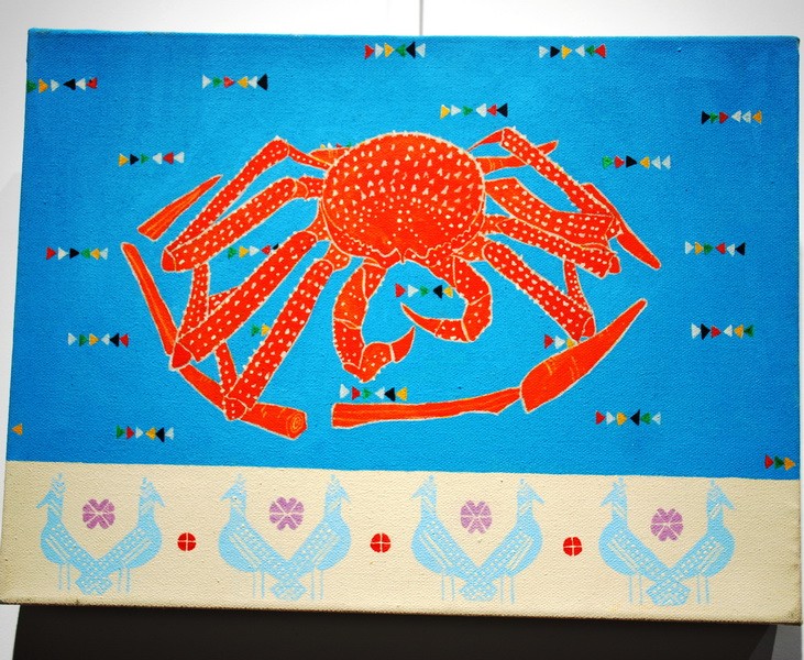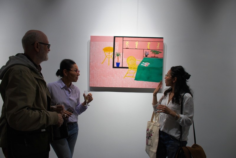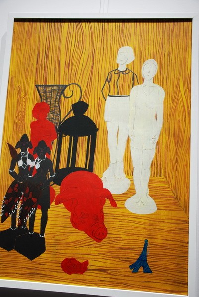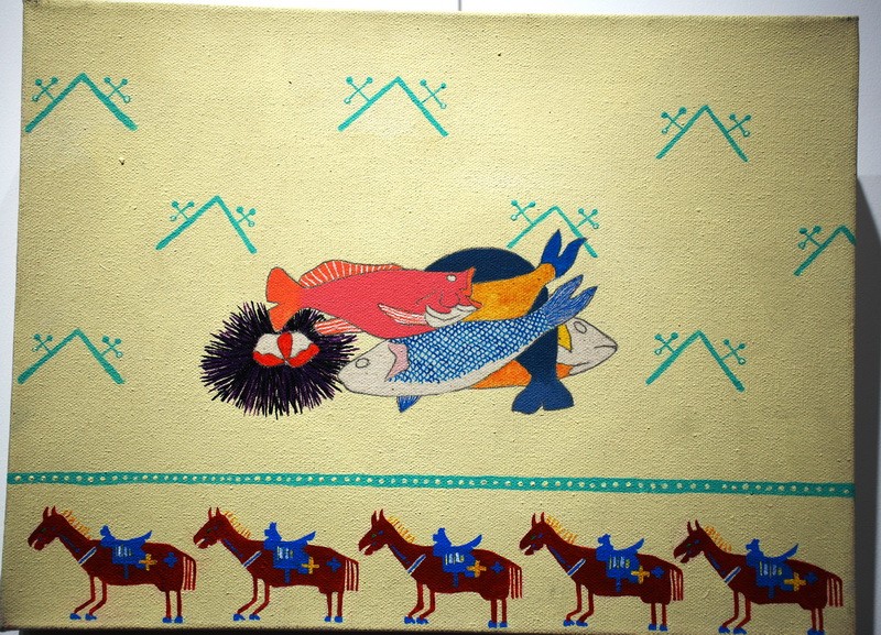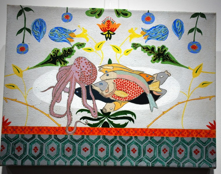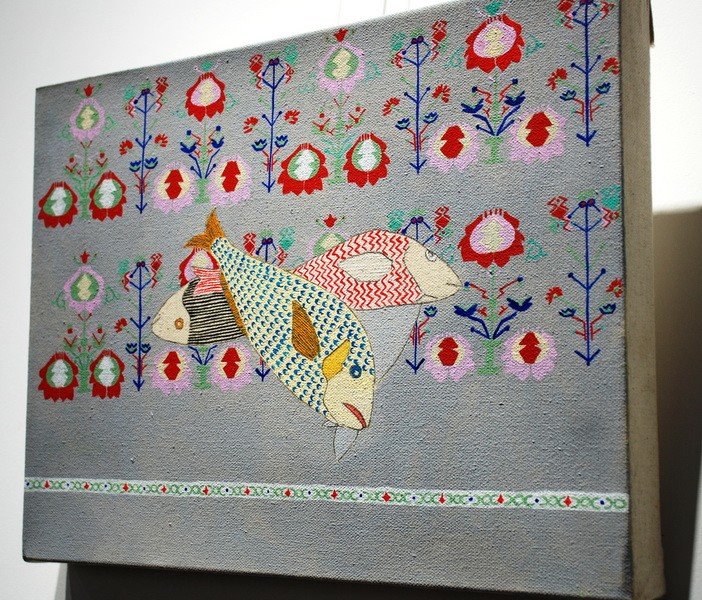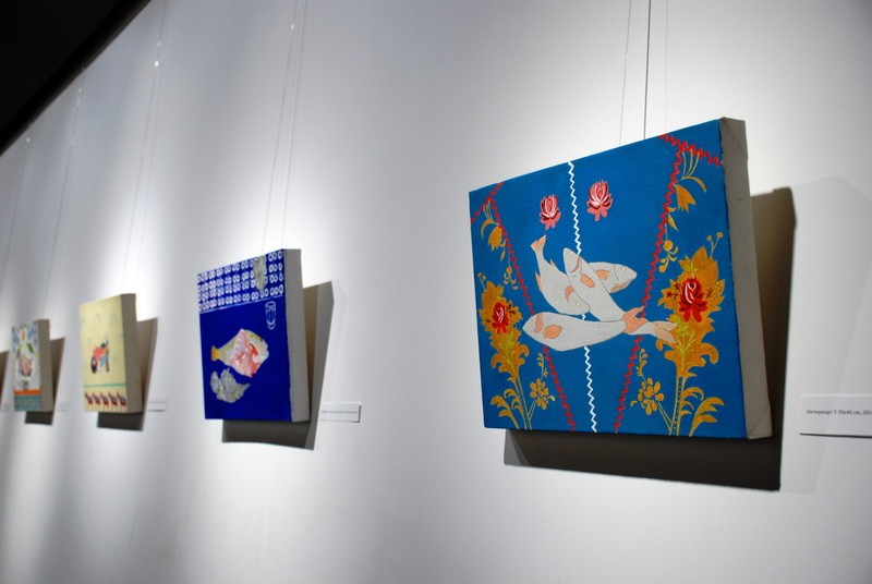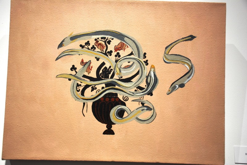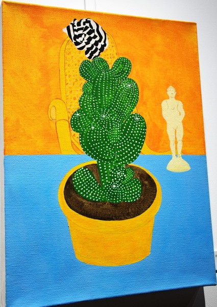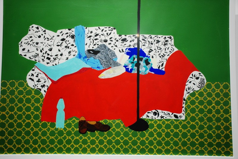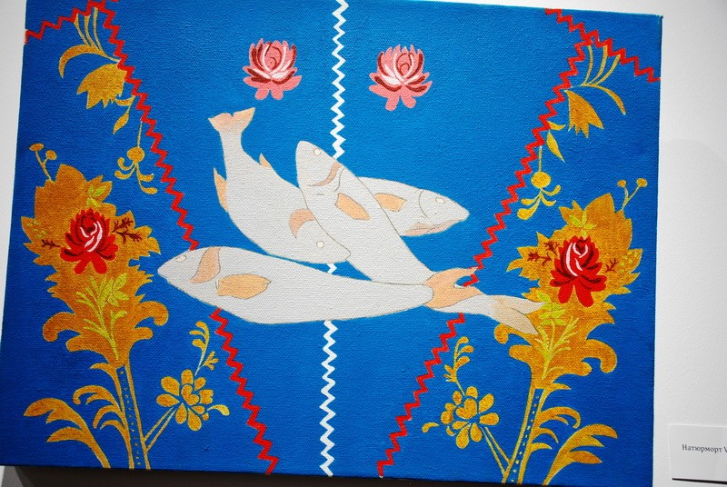 Среди работ мы заметили и автопортрет художницы, который не вписывался в рамки этого жанра. Ирэн написала свой портрет в виде диванчика, на котором раскидано много вещей, а в середине изобразила рыбу. Работа вызвала большой интерес у публики.