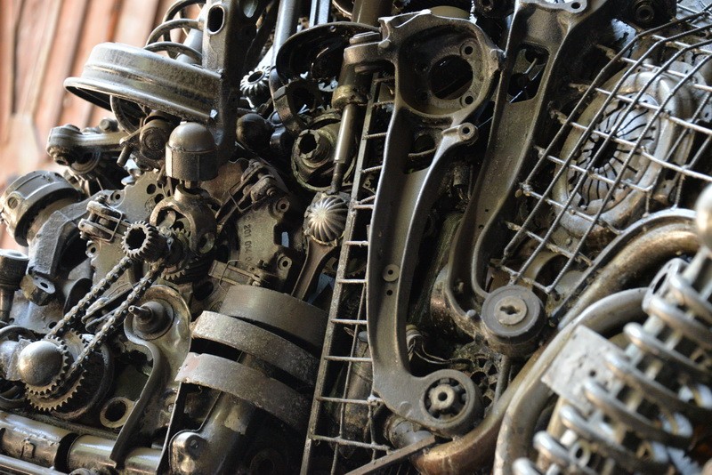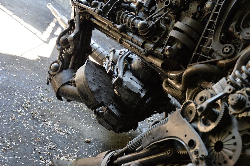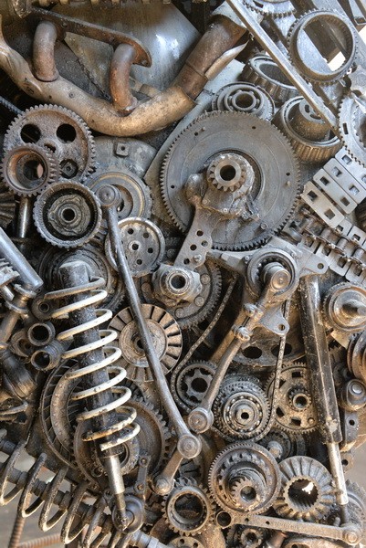 - Чего здесь только нет: шестеренки, выхлопные трубы, корзина сцепления от грузовика, коробки передач, полуоси, амортизаторы, цепи, распредвалы, диски сцепления, гидротрансформатор, радиатор, диски, редукторы, тормозные колодки. Всего и не перечислишь.