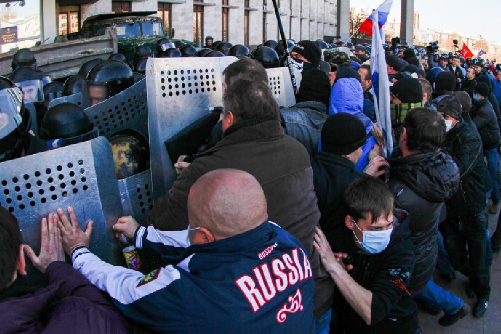 Поздно вечером в воскресенье митингующие взяли штурмом здание Харьковской областной госадминистрации, вызвав депутатов облсовета на экстренное заседание. Флаг Украины был снят с флагштока, вместо него водружен российский триколор. К прилегающей территории стащили покрышки, а на улице играла песня “Вставай, страна огромная”, которая ранее сопровождала антифашистские выступления в Севастополе. А затем с трибуны было объявлено, что опальный президент Украины Виктор Янукович уже высадился в Донецке.