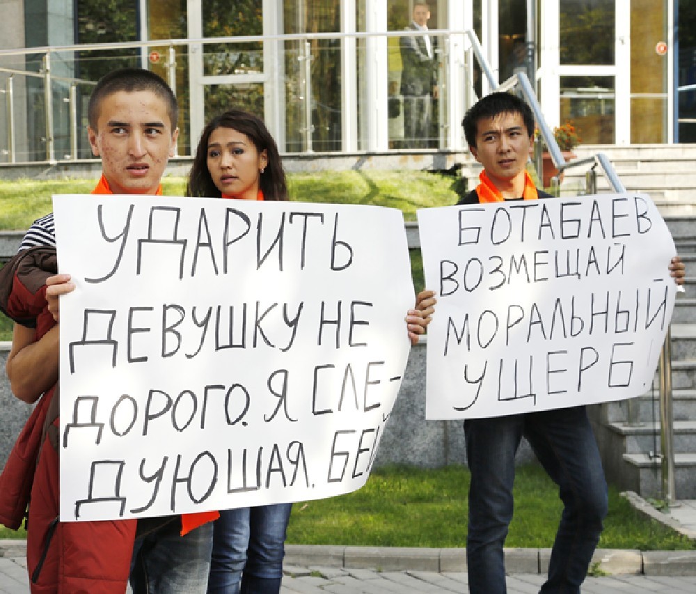 Этот инцидент не первый, когда сотрудники авиакомпаний становятся жертвами неадекватных клиентов, однако впервые за них решили вступиться представители общественной организации. Члены “Болашака” вышли к зданию банка с плакатами и долго скандировали: “Ботабаев, закон для всех един!”, “Ботабаев, выходи!”, “Ботабаев, проси прощения у девушки!”.