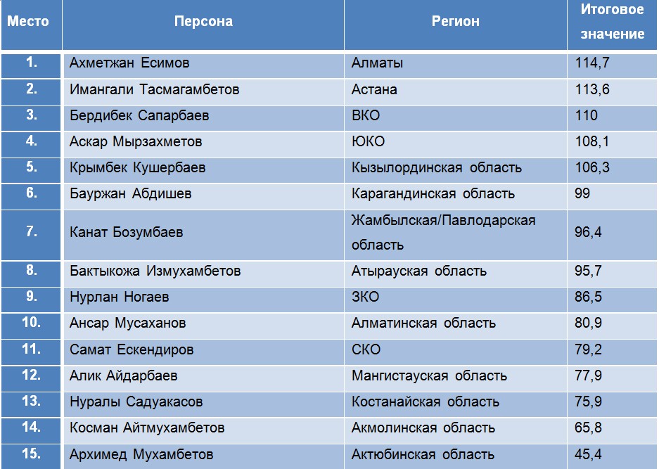 1. Ахметжан ЕСИМОВ, аким Алматы, 114,7 балла