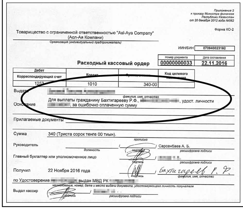 И действительно, на следующий день утром приехал курьер, привез 340 тенге. Протянул квитанцию, в которой мне надо было лишь расписаться. А знаете, какое основание для бухгалтера компании было указано в квитанции? “Для выплаты Бахтигарееву Р. Ф. за ошибочно оплаченную сумму”. Всего лишь навсего!