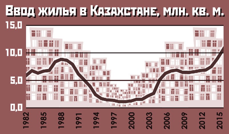 В Казахской ССР вводилось примерно по 7 млн. кв. метров жилья в год, а после событий 1986 года, прихода Геннадия КОЛБИНА и принятия программы “Жилье-91” ввод на пике 1998 года удалось поднять до 8,8 млн. кв. метров. Но тогда уже вовсю шла перестройка, экономика катилась вниз, причем темп задавало падение как раз строительства. И в результате к 1999 году мы докатились до антирекорда - всего 1,1 млн. кв. метров.