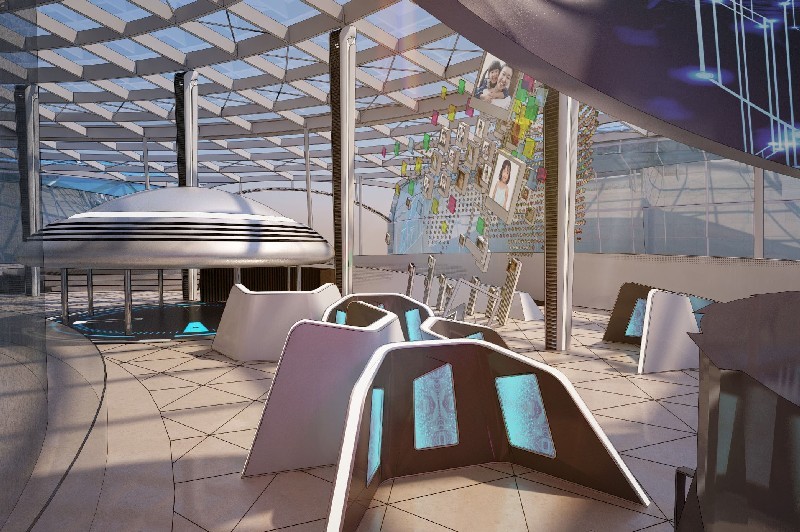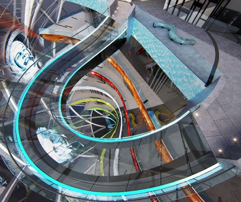 Знакомство с национальным павильоном начинается с 8-го уровня, куда можно попасть при помощи восьми лифтов. Достигая верхнего уровня, посетитель знакомится с экспозицией “Будущая Астана - столица Казахстана в 2050 году”. Скульптурная модель описывает амбиции города с учетом устойчивого развития и экологической эффективности.
