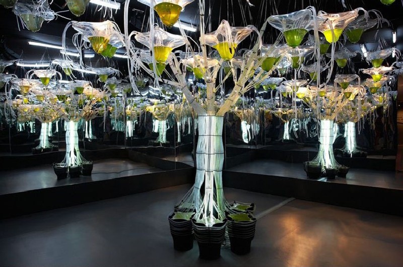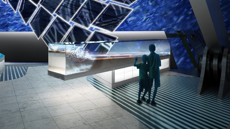 Производство энергии воды начинается с художественной инсталляции дамбы, демонстрирующей процесс образования энергии при помощи воды.