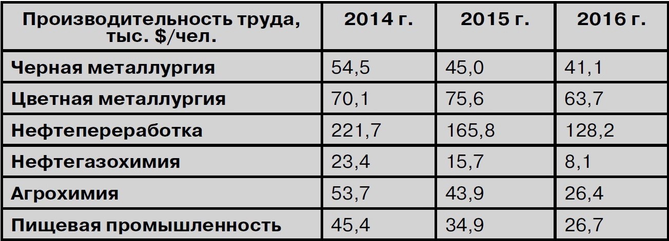 Или вот еще из запланированного: рост производительности труда в обрабатывающей промышленности на 22% к уровню 2015 года. А вот факты: 2014 год - 42,6 тыс. $/чел., 2015-й - 34,3 тыс., 2016-й - 27,4 тыс. $/чел. То есть планы - вверх, а реальность - вниз.