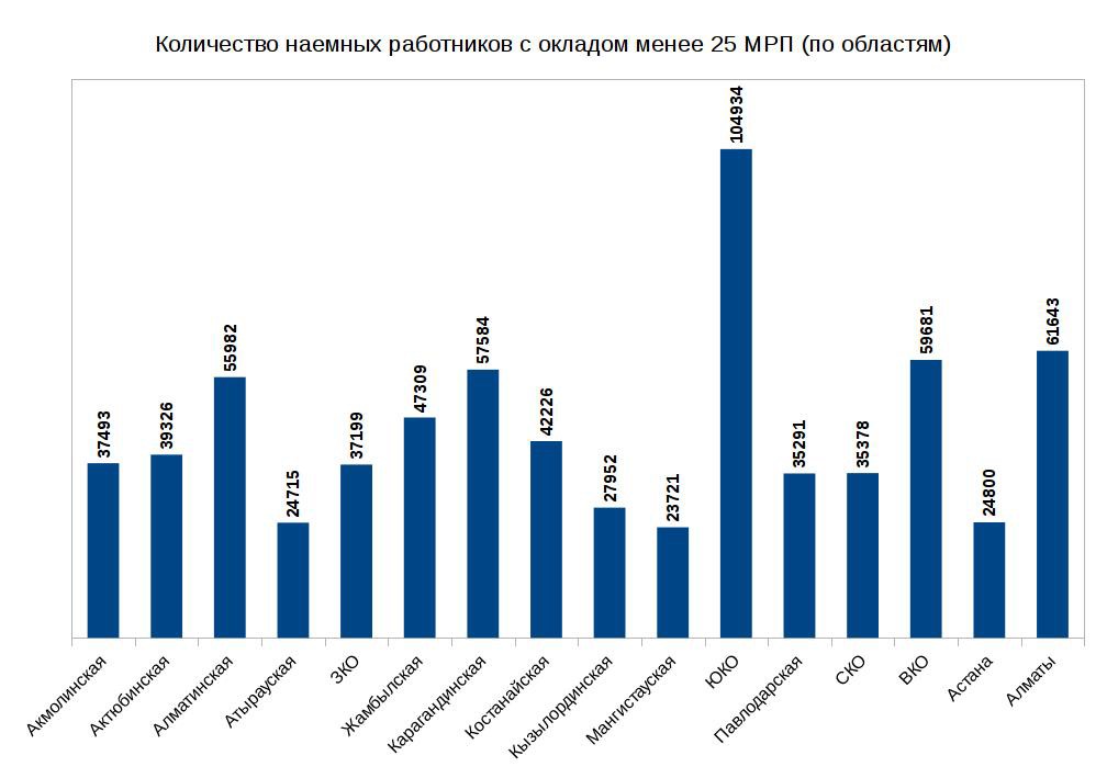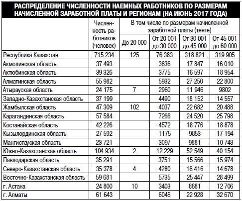 “Комитет один раз в два года проводит единовременное обследование по распределению численности работников по размерам начисленной заработной платы в Казахстане. Сбор данных проводится по всем предприятиям и организациям без учета малых предприятий, занимающихся предпринимательской деятельностью. Обследованием охватываются работники, проработавшие полностью июнь. По итогам данного обследования, проведенного в 2017 году, заработную плату до 25 МРП (60 125 тенге) получали в Республике Казахстан 715,2 тысячи человек”.