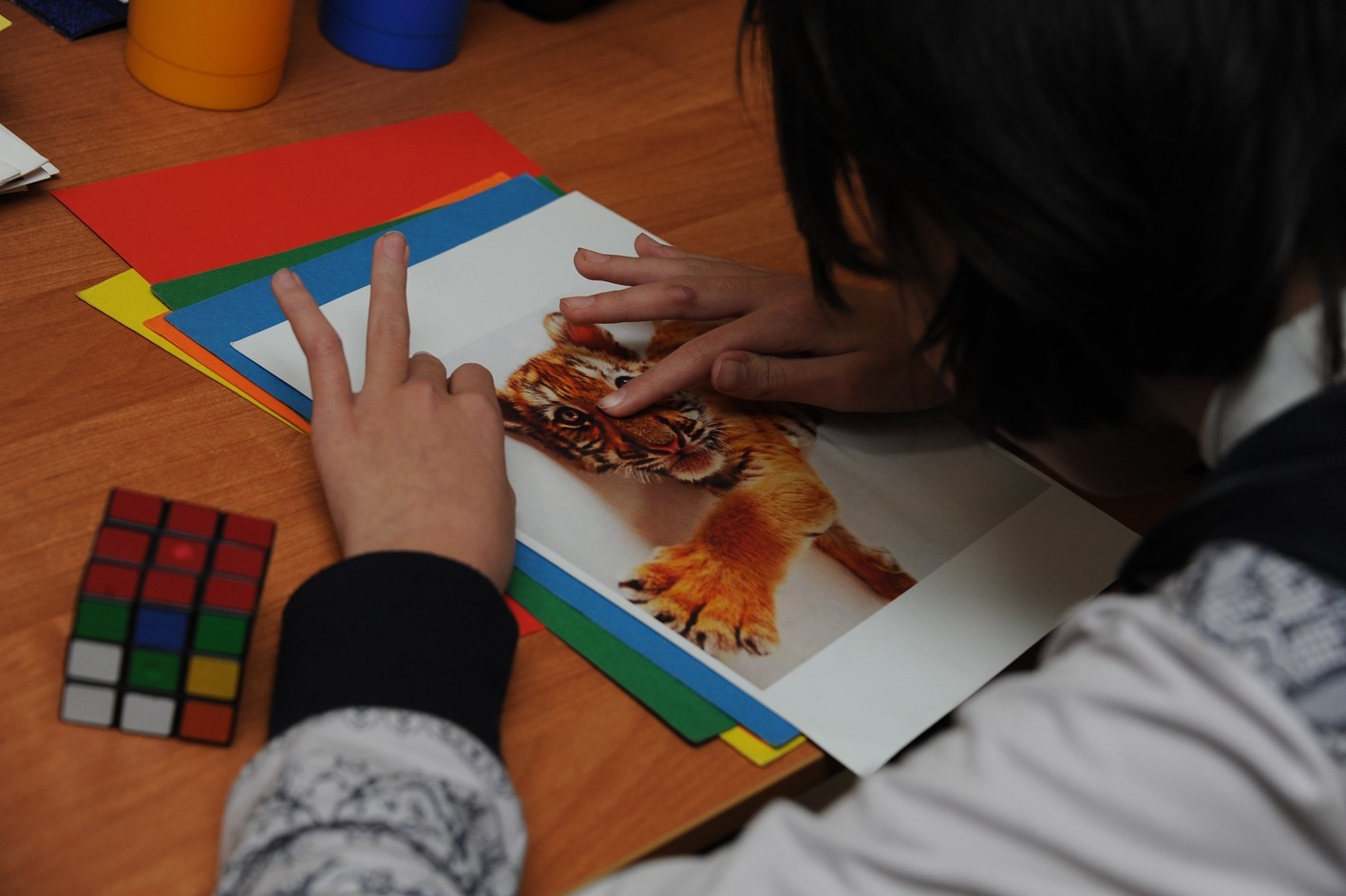 Во время занятий не происходит ничего особенного, и понять, за счет чего у человека открываются такие способности, мне лично так и не удалось. Я наблюдала за тем, как Олег и Лилия работали с восьмилетним мальчиком, который в первый раз пришел на занятие. Они просто беседовали, педагоги ненавязчиво задавали ребенку вопросы, касающиеся его жизни: “Что ты любишь делать?”, “Куда тебе нравится ходить?”. Мальчик, все время сидящий в маске, отвечал. И в какой-то момент Олег дал ему в руки красный лист бумаги и предложил назвать цвет. Ребенок задумался и безошибочно ответил на вопрос. У меня и его мамы от удивления вытянулись лица. Дальше - больше: цвета, изображения на картинках, количество и цвет стаканов, выставленных пирамидой. Мальчик, конечно, иногда ошибался, но все же процент попаданий был внушительным. Нам оставалось только развести руками.