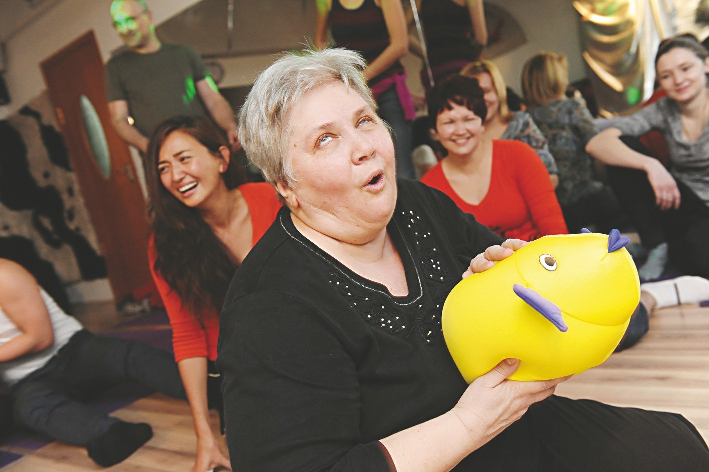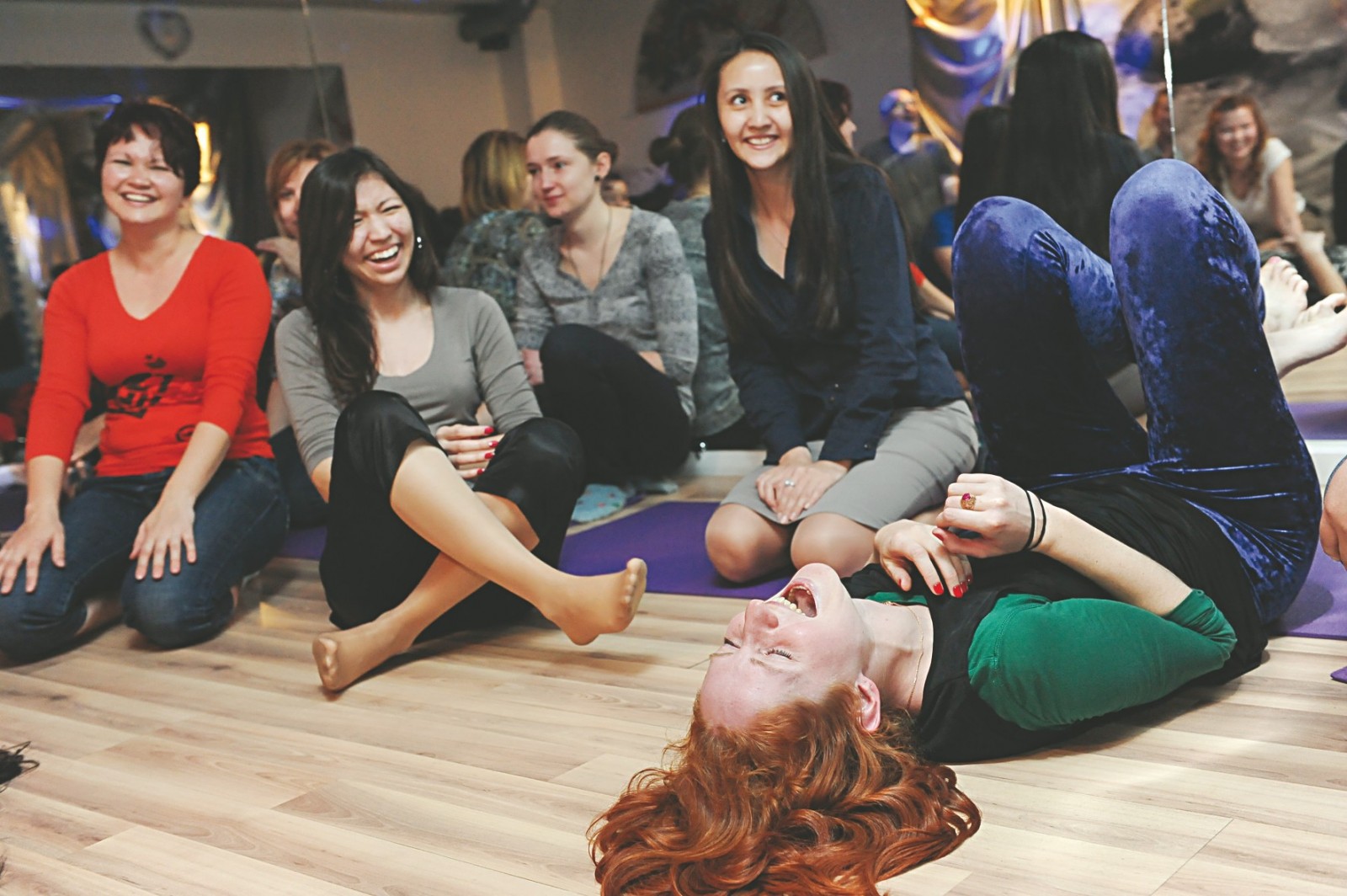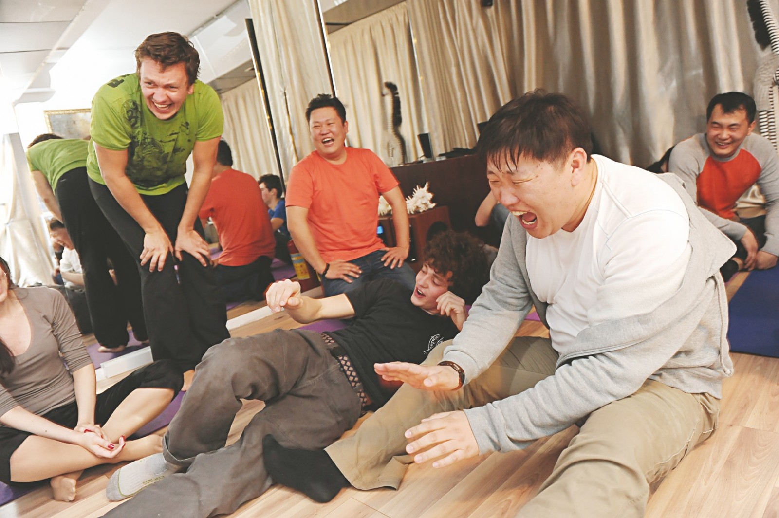 Мы приглядывались друг к другу, гадая, что будет дальше. Но с первых же минут было понятно, что скучать не придется. Первое “ха-ха” пришлось из себя практически выдавливать. Сделать это, когда на то нет ни причины, ни желания, не так уж и просто. Но это только первые секунды, потом ты подхватываешь вирус гоготания у сидящих рядом смехойогов и уже ничем от них не отличаешься. Чтобы хохотать без остановки, нужно сначала разогреться. Для этого Дмитрий подготовил несколько упражнений.
