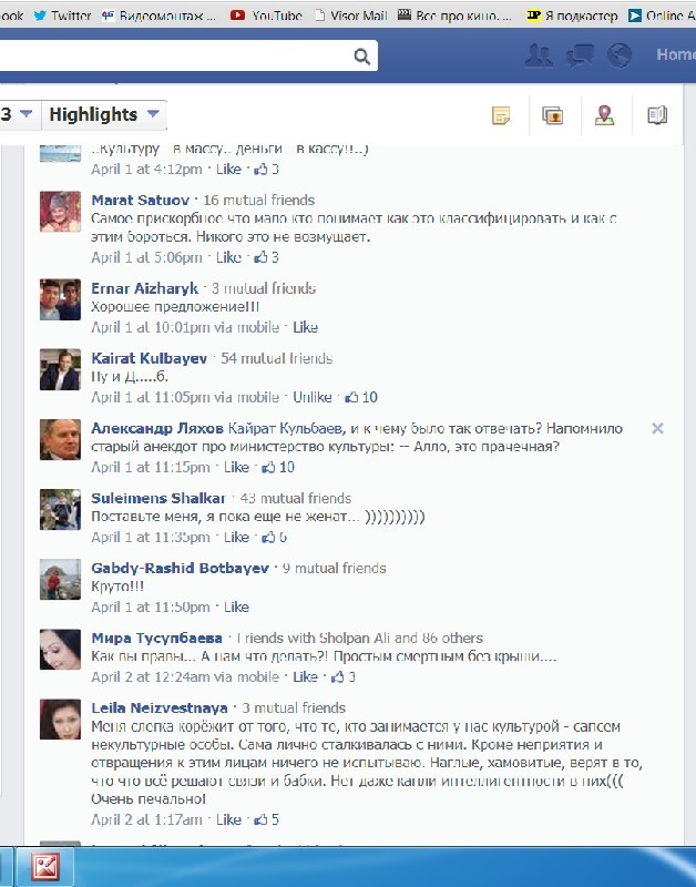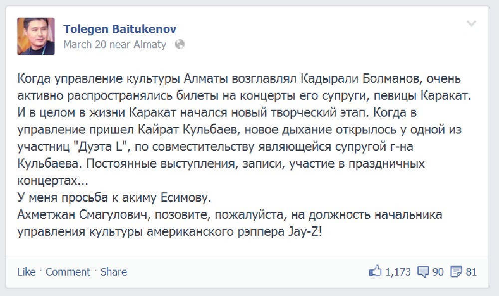 Заметка эта собрала более 1200 лайков и несколько десятков перепостов. Пошла в народ, короче говоря. Г-н Кульбаев тоже не смог пройти мимо и отметился в комментариях. Поскольку Кайрат Рахимжанович возглавляет целое управление культуры, а не какую-нибудь там прачечную, он подошел к делу со всей ответственностью, написав буквально следующее: “Ну и Д….б”.