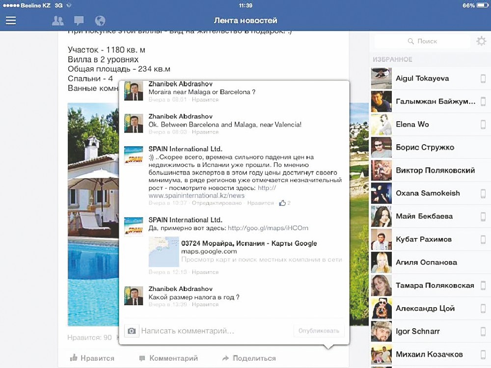 Примечательно, что господина Абдрашова вилла заинтересовала настолько сильно, что свои комментарии он оставлял несколько раз - то ранним утром, то днем. Впрочем, удалось ли ему договориться о просмотре или о скидке, мы узнать не смогли: Жанибек Жарасканович, регулярно размещающий в Фейсбуке фотографии то из Монако, то с Ямайки, то из Вены, принимать от корреспондента “Времени” предложение о виртуальной дружбе не захотел - поэтому наши вопросы остались без ответов. Хотя мы не исключаем: заместитель шефа мидовского протокола мог интересоваться престижной недвижимостью для своего друга (или родственника), не удосужившегося завести себе страничку на Facebook.