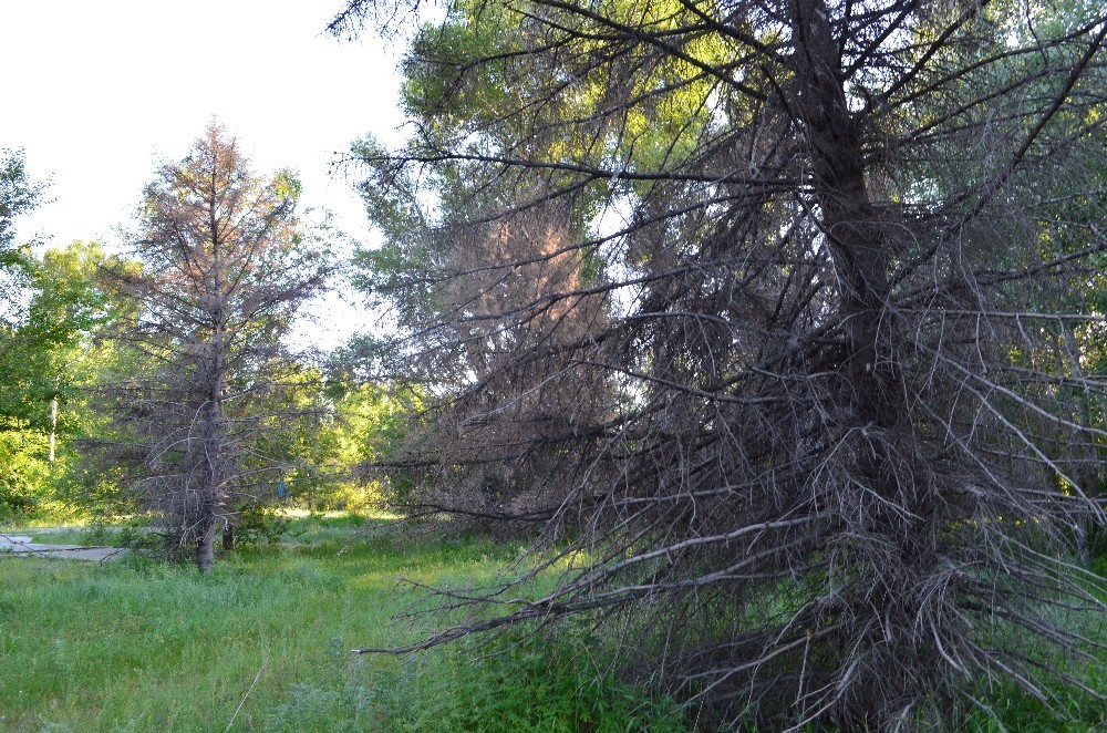 Засохшие ели, которые с площади пересадили на остров Полковничий.