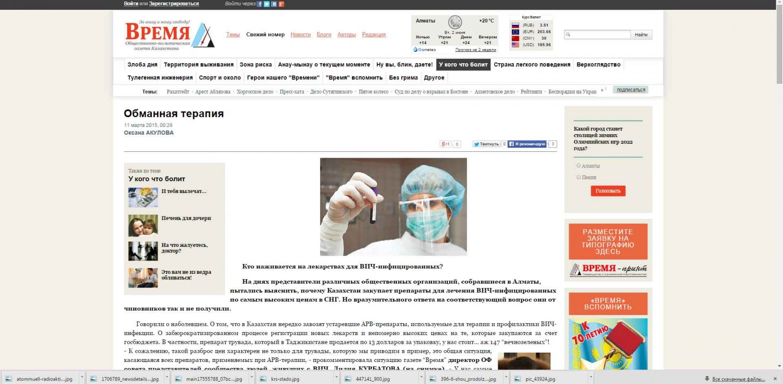 Все началось со статьи “Обманная терапия” (см. “Время” от 11.3.2015 г.), в которой говорилось, что Казахстан закупает самые дорогие на постсоветском пространстве лекарства для лечения ВИЧ-инфекции. Этот материал на нашем сайте прокомментировали несколько человек, причем четыре мнения опубликовал некто Maksat_888, не стесняясь в выражениях в адрес руководителя городского СПИД-центра. Из его постов следовало, что центр ежегодно зарабатывает миллиарды тенге, которые неизвестно как расходуются, при нехватке кадров увольняются грамотные врачи, закупаются дешевые тесты для определения ВИЧ-инфекции. Бапиев все это прочитал и обратился с заявлением в полицию, требуя привлечь автора комментариев за “заведомо ложные сведения, которые порочат честь и достоинство, подрывают репутацию” руководителя СПИД-центра.