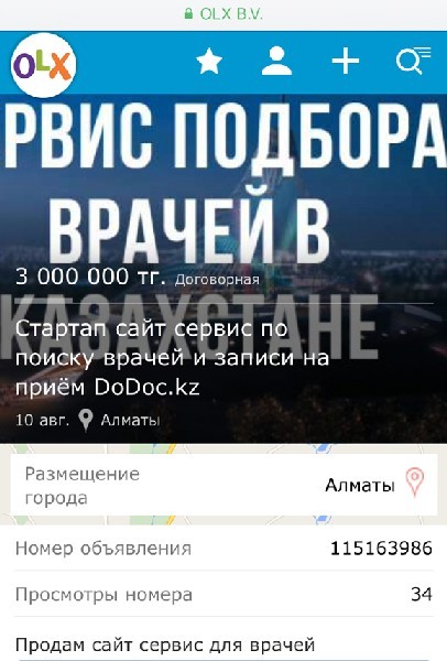 Мало того, на казахстанской торговой интернет-площадке olx.kz аналогичный сервис уже выставлялся на продажу (см. скриншот № 1)! Причем по дешевке - всего за три миллиона тенге. Его авторы обещают снабдить интернет-пользователей информацией о лучших врачах и обеспечить запись к ним на прием, ну а покупателю этого сайта - хорошие барыши за посредничество между лекарями и больными. То есть вся суть его работы такая же, как у проекта - победителя инновационного конкурса! Как говорится, берите и пользуйтесь! Зачем платить больше?