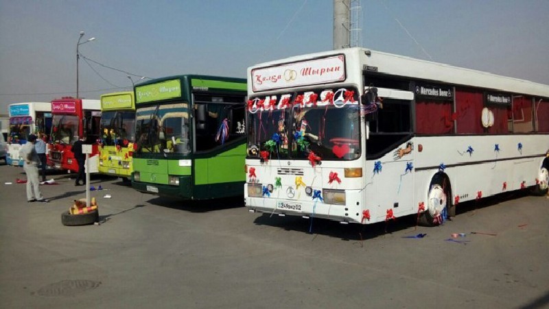 На видео несколько машин, украшенных лентами и цветами, проезжают по улице Пушкина в районе Зеленого базара и сигналят. На окнах автобусов начертаны имена новобрачных - Қалқа и Шырын. Как сообщил портал Tengrinews, так отметил свадьбу 23-летний водитель 11-го маршрута Калка ЖОЛДАС. Он сообщил, что проблем с руководством автопарка не было, его коллегам разрешили взять на время пять автобусов