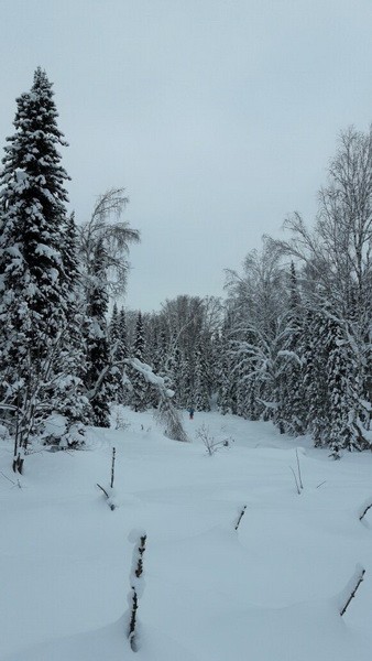 Нам выдают широкие огромные охотничьи лыжи, подбитые мехом. С непривычки с трудом поднимаю ноги. После нескольких падений все же удается приноровиться, и я уже могу наслаждаться красотами вокруг. На тропе то и дело попадаются следы животных.
