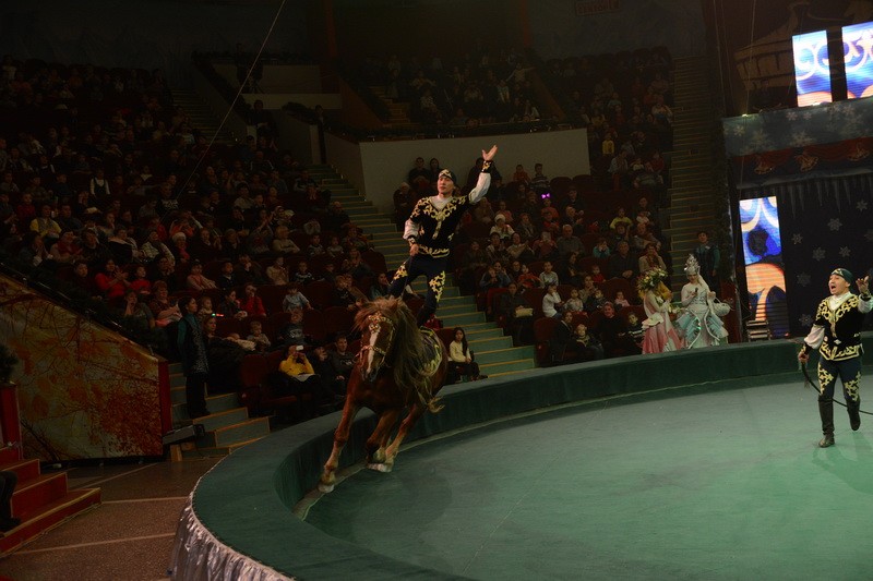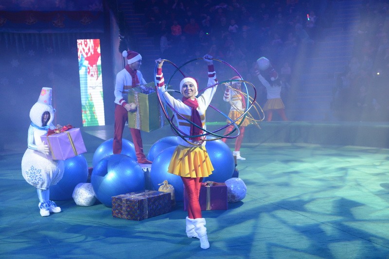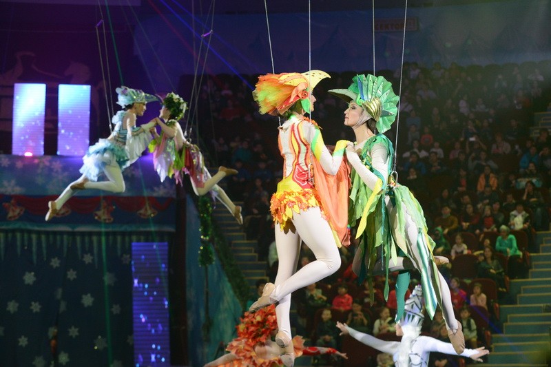 К слову, в представлении задействовано много юных талантов. К примеру, 11-летняя Марина СТАРОДУБОВА и Даяна ЖЕТПИСОВА в образе лошадки Пинки Пай и 12-летняя Анастасия ДЕМИДОВА в роли Снеговика бесстрашно парят под куполом цирка без страховки. Зрители с замиранием сердца следили за их трюками.