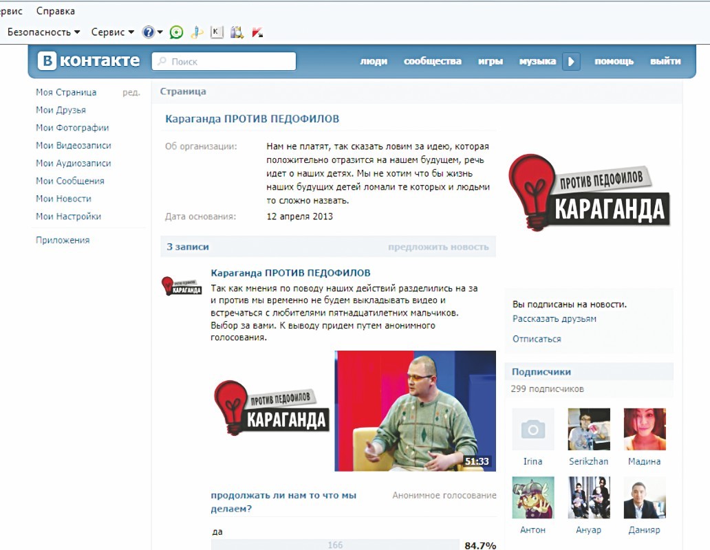 Идею столь неоднозначной борьбы с извращенцами карагандинские Робин Гуды позаимствовали у российского охотника за педофилами из протестного движения “Окуппайпедофиляй” Максима МАРЦИНКЕВИЧА по прозвищу Тесак. Этот активист, к слову, прославился еще и расистскими воззрениями, отчего приковал к себе внимание российских спецслужб. Его последователи из казахстанского шахтерского края, по их уверениям, к политике отношения не имеют. Ловлей коварных детолюбов они начали заниматься по чисто идейным соображениям. Мол, не желают, чтобы нелюди ломали жизни детям. На электронной страничке своего сообщества “Караганда против педофилов” ребята также подчеркивают, что за “ратное дело” никто им не платит.