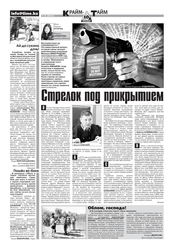 Напомним, в феврале 2008 года в ходе произошедшей в Алматы возле компьютерного клуба потасовки двое молодых людей получили ранения из травматического пистолета (см. “Игры “золотой” молодежи” и “Стрелок под прикрытием”, “Время” от 10.12.2008 г. и 7.8.2013 г.). Один из пострадавших, Михаил ВИНОГРАДОВ, спустя восемь дней скончался в больнице. Стрелявший в Михаила и его друга Азамат Имашев (его мать на тот момент работала в прокуратуре Бостандыкского района - того самого, где и произошло преступление. - М.А.) был задержан, однако практически сразу вышел на свободу, так как заявил, что в момент драки находился якобы в Семее. Когда полицейские выяснили, что это ложь, было уже поздно - парень сбежал. Обвинение ему предъявили заочно и объявили в розыск.