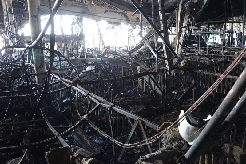 Тем временем мы уже пробрались на то самое место, откуда и начался пожар. Шестой этаж. Крыша над кинотеатром в здании “Алматы Тауэрс”. Под ней был батутный парк: всюду повисшие на тросах пружины, внизу - остатки разноцветного брезента. Группа полицейских работает в дальней стороне помещения, расположенной возле стены, которая еще пару дней назад отделяла его от улицы. Судя по всему, именно там и находятся тела погибших.