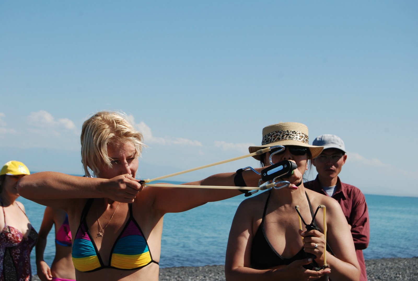 Затем на старт вышли любители популять из рогатки. В отличие от прошлого года в этот раз мишени, в качестве которых были пустые банки из-под пива, решено было подвесить - это намного усложнило задачу.