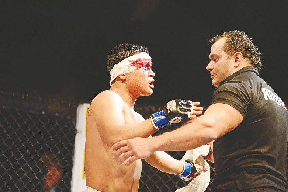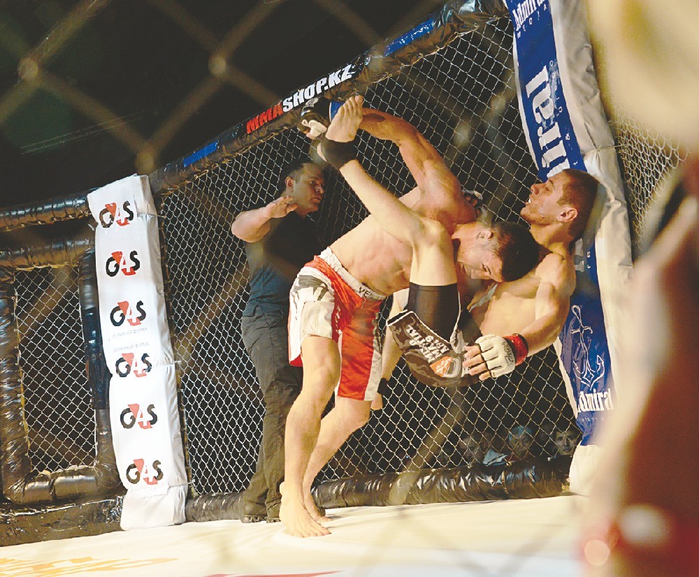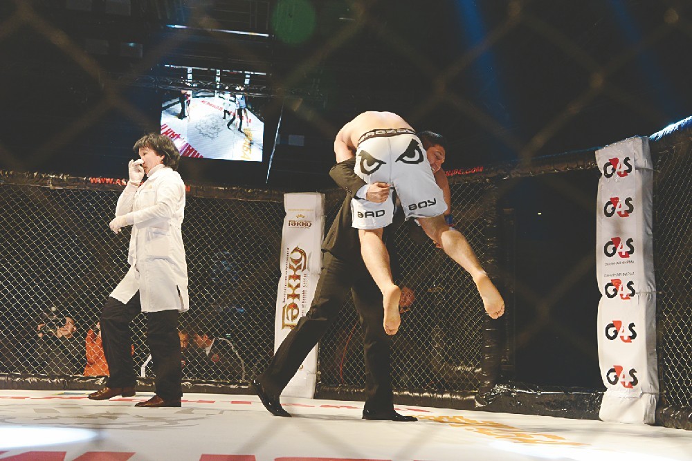Шестой бой в весе до 61 кг можно смело назвать центральным. За пояс чемпиона мира по версии Alash Pride FC сражались Асулан ТОКТАРБАЕВ (Арыстан) и американец Кевин КРУМ (Жестко бьющий деревенщина). На счету Кевина в ММА 16 боев, 12 из которых он выиграл. Причем семь последних побед он одержал в турнирах Bellator, о которых наши файтеры пока только мечтают. Тем не менее капитан “Алаш Прайд” очень уверенно начал поединок, раз за разом нанося точные удары в голову американца. Но в одной из атак Асулан пропустил удар коленом. Нельзя сказать, что он потряс казахстанца, но здорово рассек ему лоб. Рефери в октагоне Карен ПАШИКЯН даже вынужден был остановить бой, что, конечно, не понравилось Круму. Пока Токтарбаеву перевязывали голову, Деревенщина яростно возмущался, предъявляя претензии организаторам соревнований. Но потом успокоился и продолжил поединок с раненым Арыстаном. К сожалению, травма не позволила казахстанцу в полную силу бороться с очень мастеровитым соперником. И наш тренерский штаб выбросил белое, залитое кровью полотенце.