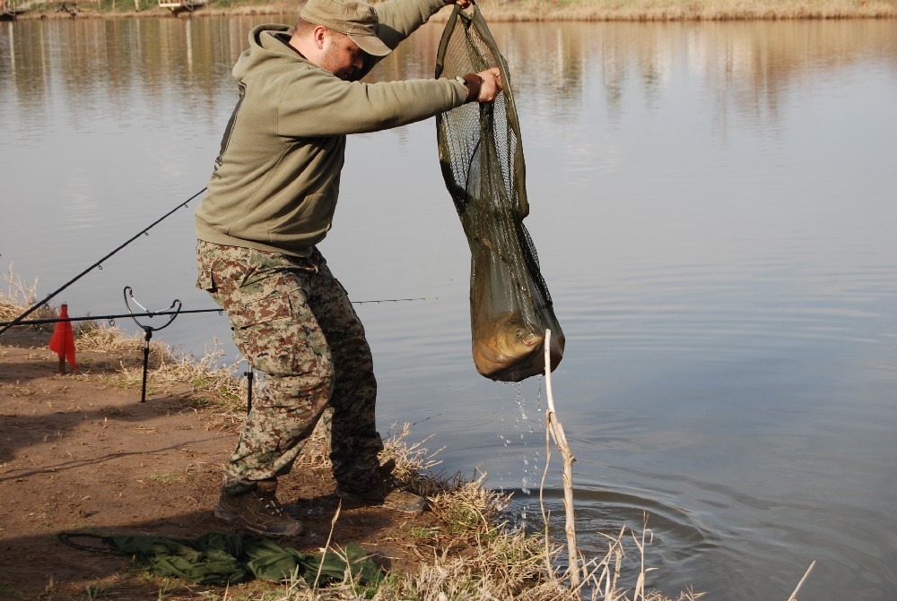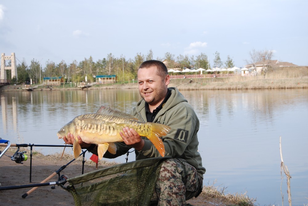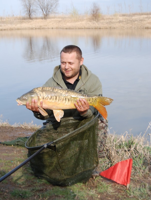 В течение нескольких минут мы наблюдали дуэль рыбы с мастером. Когда из воды показалась голова трофея, то стало понятно, что на крючок попался большой зеркальный карп.