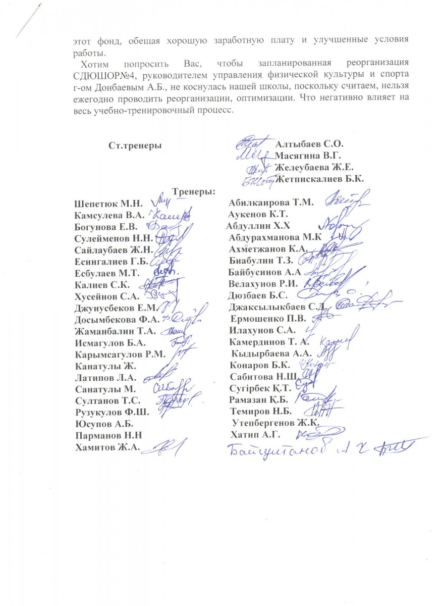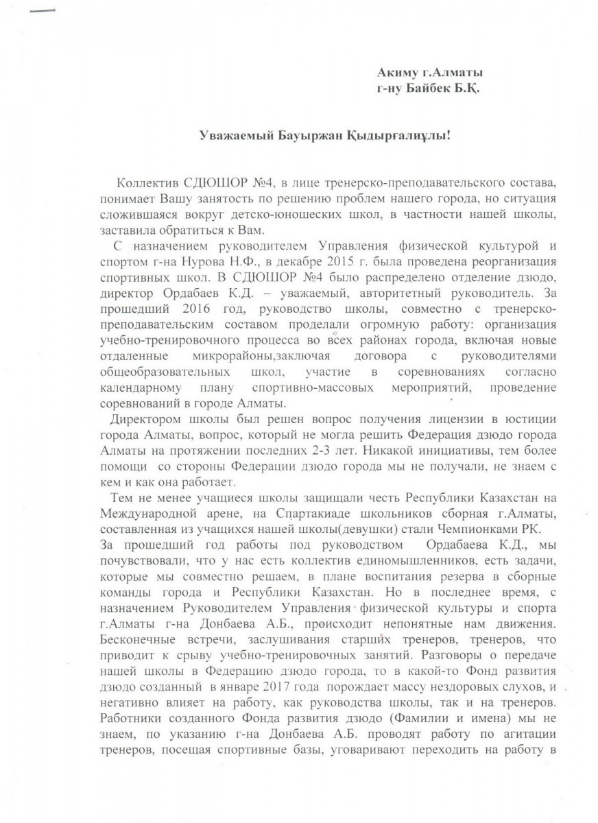 Тренеры СДЮШОР № 4 написали коллективное письмо акиму Алматы Бауыржану БАЙБЕКУ. Специалисты дзюдо очень надеются, что градоначальник разберется в этой непростой ситуации и не даст погибнуть одному из самых популярных видов спорта в южной столице. А “Время” будет следить за развитием этих околоспортивных событий. И не только в дзюдо.