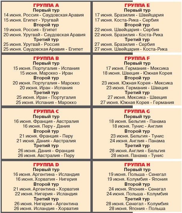 Поэтому по многочисленным просьбам любителей футбола мы публикуем полный календарь ЧМ-2018.