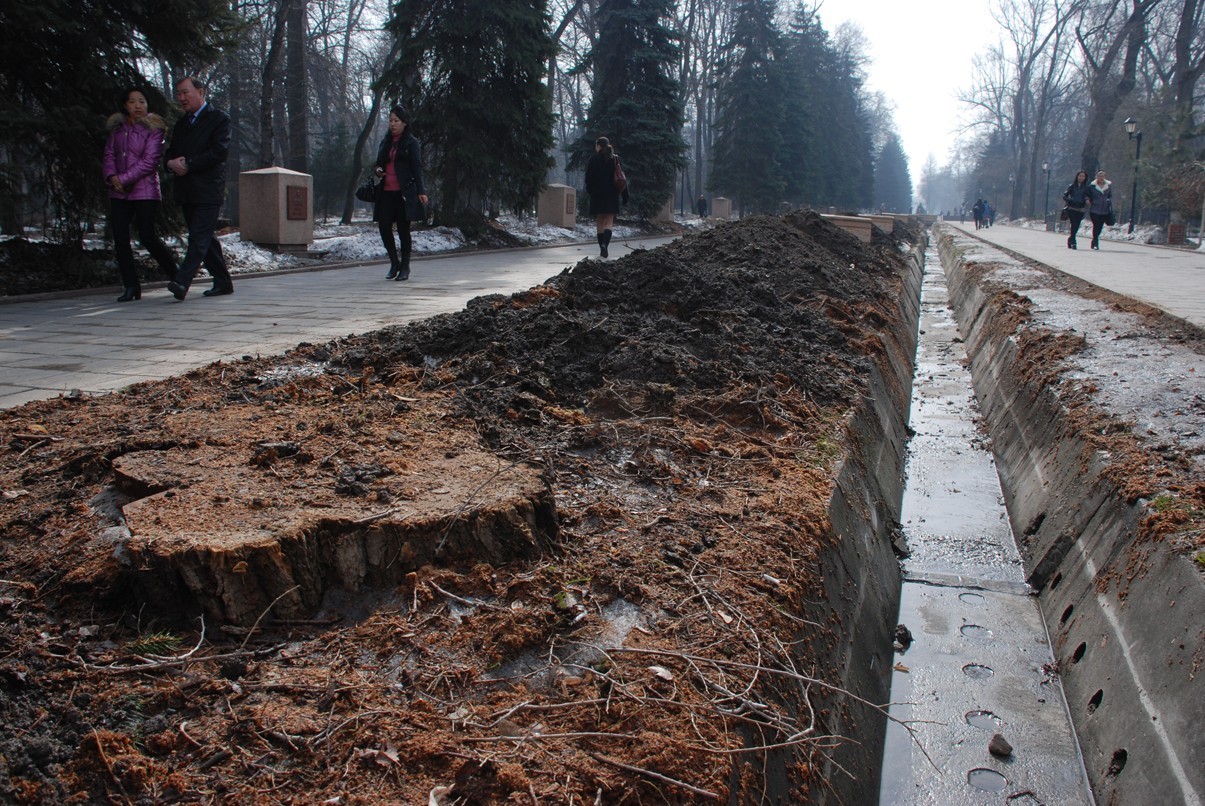 Обойдя всю аллею, мы не нашли среди останков вчерашних деревьев-исполинов ни одного трухлявого пня. Теперь излюбленное место отдыха алматинцев представляет собой унылое зрелище.