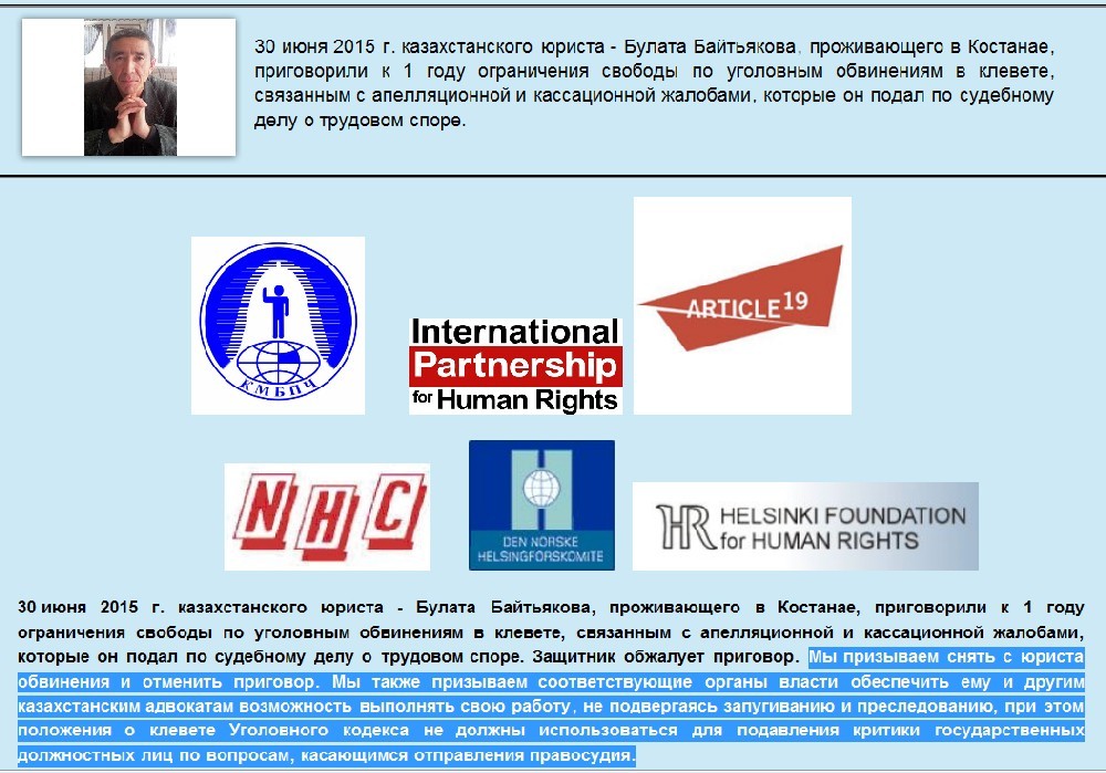 Весть о том, что прежде безвестного юриста поддержали коллеги из различных правозащитных организаций Европы, наверняка обескуражила преследователей Байтьякова - суд, надзор и следствие. Все-таки возмущение, выраженное Международным партнерством по правам человека (Бельгия), Хельсинкским фондом по правам человека Польши, Норвегии и Нидерландов, британским Article 19, - это вам не фунт изюма (см. скриншот сайта bureau.kz на этой стр.)!