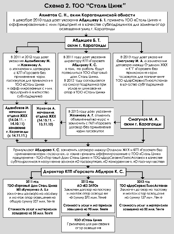Гособвинение посчитало доказанным тот факт, что Серик Ныгметович в период с 2011 по 2013 год неоднократно давал указания акимам Караганды Бауржану АБДИШЕВУ и Мейраму СМАГУЛОВУ приобретать в обход законодательства о госзакупках для нужд города опоры освещения у фирмы “СтальЦинк” и аффилированных с ней предприятий. Притом по завышенной стоимости. В результате принадлежащее сыну тогдашнего премьера предприятие (руководил которым, кстати, его брат Берик) получало хорошую прибыль. По подсчетам следователей, государству был причинен материальный ущерб в размере 201 миллиона тенге (см. схему № 2).