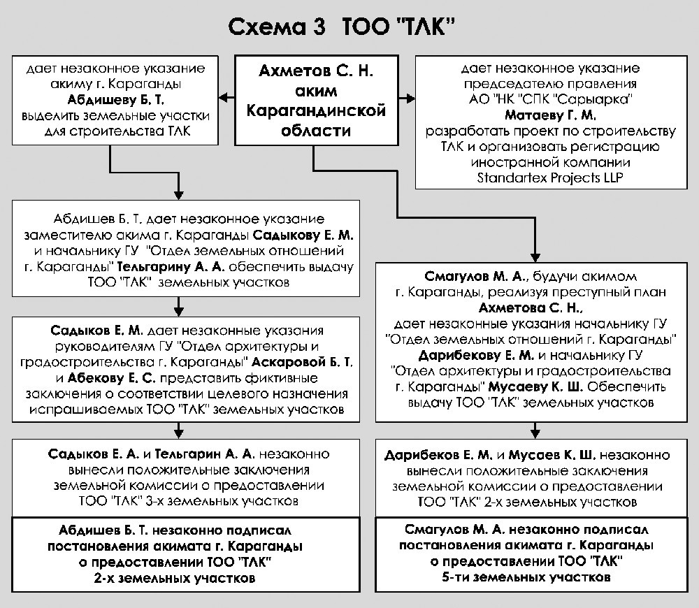 Серику Ахметову также вменяют в вину создание еще одного личного бизнеса - ТЛК. При содействии уже упомянутых акимов Караганды Смагулова и Абдишева под строительство комплекса было выделено семь земельных участков общей площадью свыше 38 гектаров. Ранее эти участки были под разными предлогами изъяты в госсобственность у юридических и физических лиц. Следствие установило, что Серик Ныгметович, будучи председателем координационного совета, незаконно использовал 282 миллиона тенге из средств, выделенных по госпрограмме “Дорожная карта бизнеса-2020”, на строительство инфраструктуры комплекса. Следствие уверено, что Ахметов планировал завуалированно выступить в роли “иностранного инвестора” объекта, для чего поручил Габиту Матаеву открыть фирму за рубежом. Матаев обратился за помощью к своему племяннику КУШЕРБАЕВУ, который зарегистрировал в Великобритании компанию Standartex Projects LLP. В дальнейшем туда переводились личные деньги Ахметова, которые потом возвращались в Казахстан под видом иностранных инвестиций (см. схему № 3).