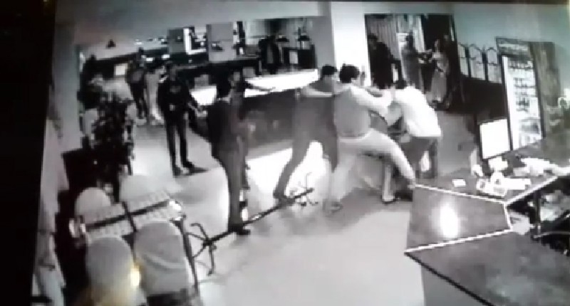 Драка попала в объективы установленных в развлекательном заведении видеокамер. На кадрах запечатлелось, как молодчики мутузят оппонентов с помощью попавших под руку предметов: киев, шаров, вилок, столовых ножей, вешалок. Видно, что один из молодых людей в упор стреляет в противника из пистолета (по предположениям пострадавших, травматического “Стражника”). Люди суетятся и бегают по залу. Две женщины по очереди пытаются остановить накинувшихся на их мужей парней. И обе получают такие мощные удары в лицо, что тут же валятся с ног. Затем “победители” решают сбежать с места происшествия, пряча свои физиономии под натянутыми на голову футболками.