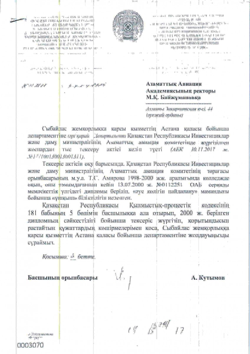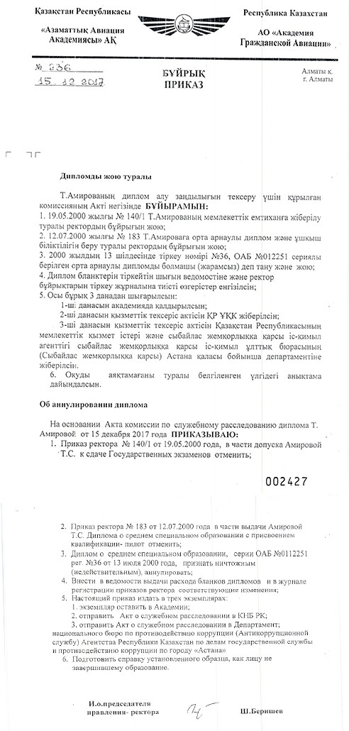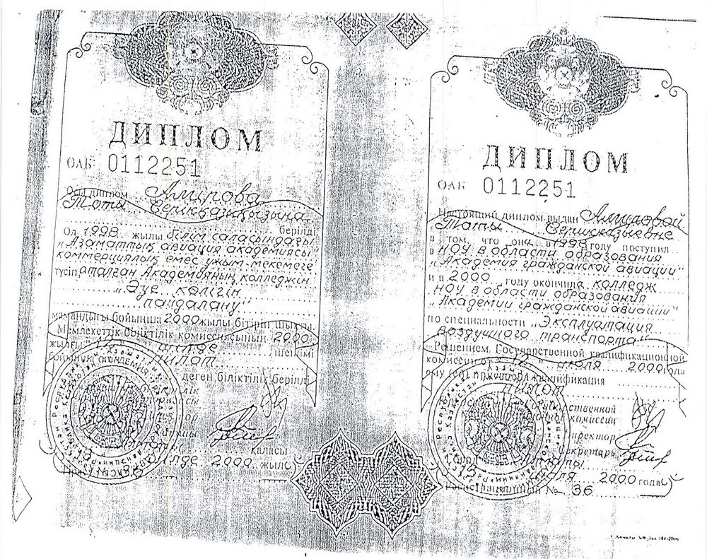 На прошлой неделе наша газета опубликовала материал, посвященный странностям в обучении и.о. заместителя председателя комитета гражданской авиации Тоты Амировой. В распоряжении редакции оказались документы, подтверждающие тот факт, что высокопоставленная чиновница незаконно получила диплом об окончании колледжа при Академии гражданской авиации в далеком 2000 году. Поступала госпожа Амирова на инженерный факультет академии, чтобы после четырех лет обучения получить высшее образование и квалификацию пилота, но выпустилась из учебного заведения через два года. При этом в ее бумагах была такая путаница, что даже удивительно, почему ей в итоге разрешили летать. Однако спустя 18 лет специально созданная комиссия доказала, что диплом был выдан с огромными нарушениями (см. “Давайте, Тоты, учиться!”, “Время” от 13.12.2018 г.).