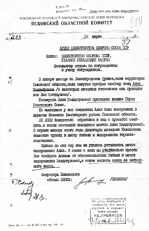 - Совершенно верно: их там нет. В архивных документах мы наткнулись на интересную приписку: Аня Молдагулова (в некоторых документах Алия числится как Аня. - Н. П.) захоронена в 300 метрах от деревни Пичевка в могиле №84. В этом захоронении “числилось” четыре женщины: медсестра, фельдшер и два снайпера. Одна из них, вероятнее всего, и была Алия, на 90 процентов параметры обнаруженных останков совпадают с данными Молдагуловой: небольшой рост, азиатский тип внешности, рана на руке. Мы свозили эти останки на экспертизу в Великие Луки, но там сказали: чтобы выводы были точными, надо делать генетический анализ. Мы передали родным Алии соскобы с тазовой области и черепа ее останков, чтобы они провели более детальное обследование. А сами останки мы перезахоронили в братской могиле на мемориале воинам в деревне Моноково.