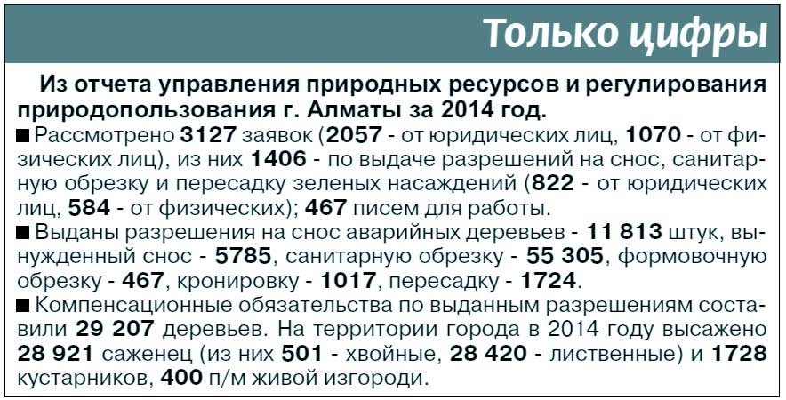 Последние несколько лет власти города занимались все больше сносом старых и больных деревьев. Как сообщал в 2013 году аким Алматы Ахметжан ЕСИМОВ, вырубка аварийных зеленых насаждений должна закончиться в 2014-м. Однако под шумок не прекращается уничтожение вполне здоровых зеленых насаждений. Так, совсем скоро канет в Лету сквер на пересечении улиц Гоголя и Муратбаева, где собираются строить жилой комплекс.