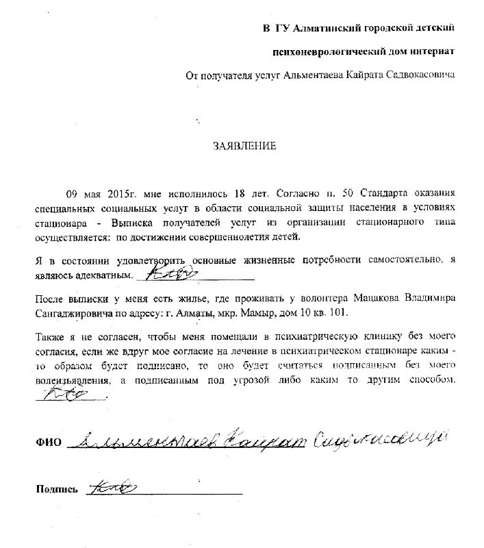 Абдинова помогла Кайрату подготовить заявление, что он отказывается от госпитализации в психиатрическую больницу. Есть закон, предусматривающий согласие здравомыслящих совершеннолетних граждан об их лечении или госпитализации. Однако, рассказывает Мацаков, когда он пришел к юноше на свидание, чтобы тот подписал заявление, сотрудники ДПНДИ воспрепятствовали этому, выхватив лист из рук предпринимателя.