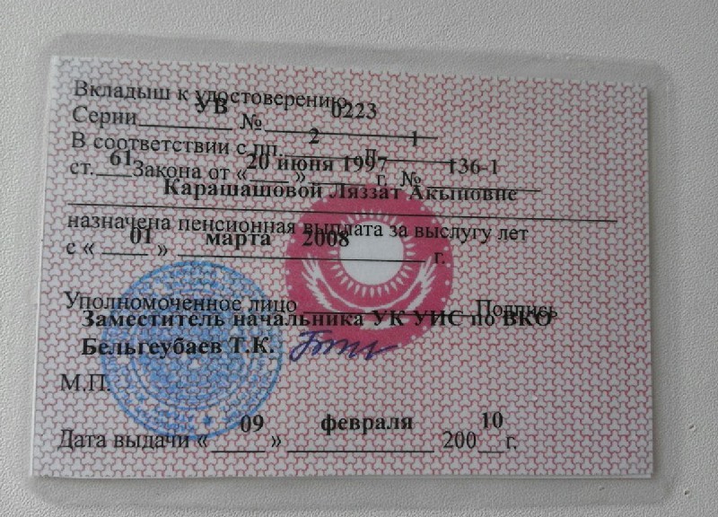 - С января 2016 года были внесены изменения в закон, и меня опять признали пенсионеркой, - продолжает Ляззат Карашашова. - Коллеги начали обращаться в ДУИС по ВКО, писать заявления. Сходила туда и я, чтобы получить информацию. Пенсия рассчитывается исходя из оклада и надбавки за звание. Берут мою майорскую зарплату 2008 года и по ней высчитывают - получилось 32 тысячи! То есть меня оформляют так, как будто я в 2016 году впервые выхожу на пенсию, не работая восемь лет! То есть, получается, ДУИС учитывает только свои интересы.