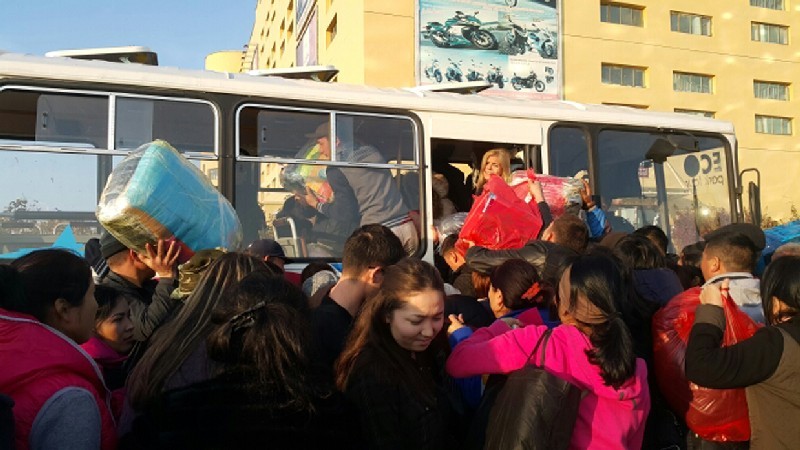 Как только на площадке появляется автобус, толпа бросается к нему, толкая и сбивая друг друга. В это время подъезжает второй автобус, который тоже берут приступом. Тут я вижу в действии так называемых толкачей - еще одно порождение МЦПС “Хоргос”. Эти люди помогают впихнуть тебя с твоим грузом в автобус, разумеется, за деньги.