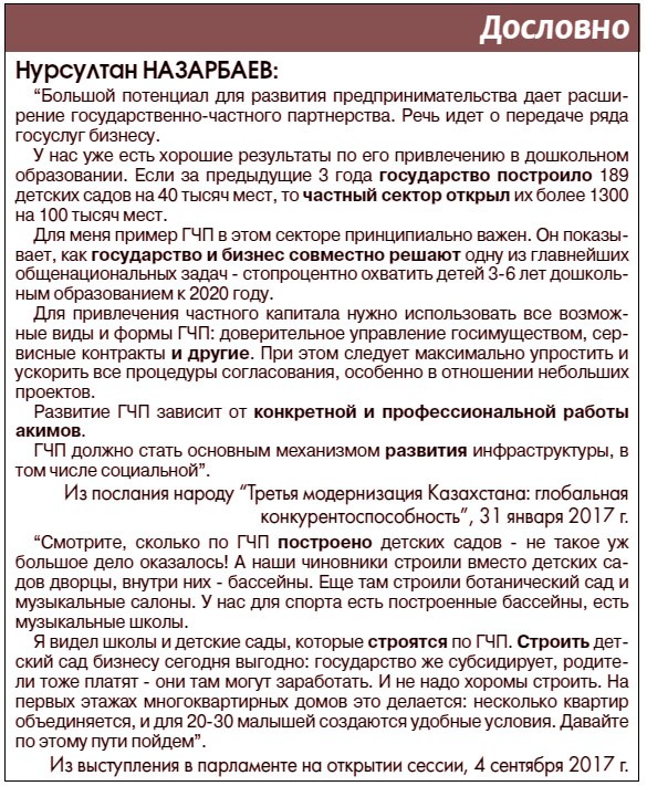 Президент в своем еще прошлогоднем послании народу поставил задачу развивать экономику и социальную инфраструктуру страны, используя предпринимательский потенциал через механизмы ГЧП, и в том числе решить наконец головоломную проблему дефицита дошкольных учреждений в стране. Проще говоря, государство признает, что не в силах само решить проблему нехватки детских садов, и предлагает бизнесу сделать это совместно: на взаимовыгодных условиях открыть новые детсады, а где это необходимо - реформировать на ладан дышащие старые. Прекрасное партнерство - что тут скажешь!