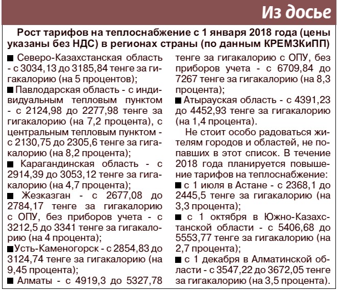 Как пояснили “Времени” в комитете по регулированию естественных монополий, защите конкуренции и прав потребителей (КРЕМЗКиПП) Министерства нацэкономики, повышение тарифов было оговорено еще в 2015 году, а причина их роста - в увеличении стоимости стратегического товара (уголь, газ, мазут, дизельное топливо), используемого в качестве топлива для производства тепловой энергии, в росте предельных тарифов на электроэнергию и оптовых цен на товарный газ, утверждаемых Министерством энергетики.