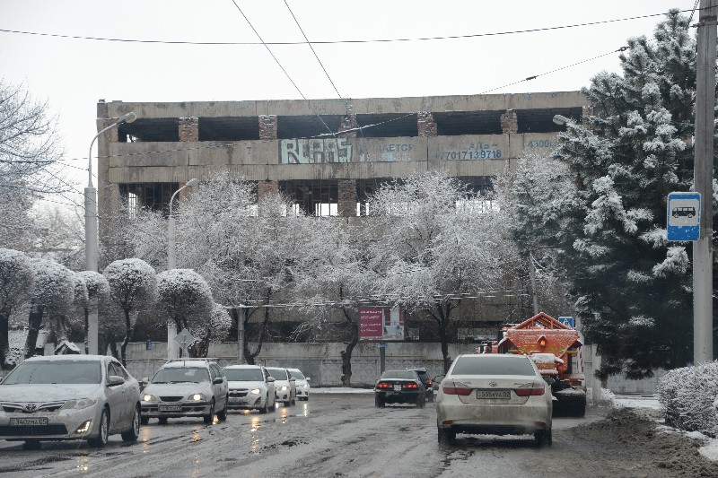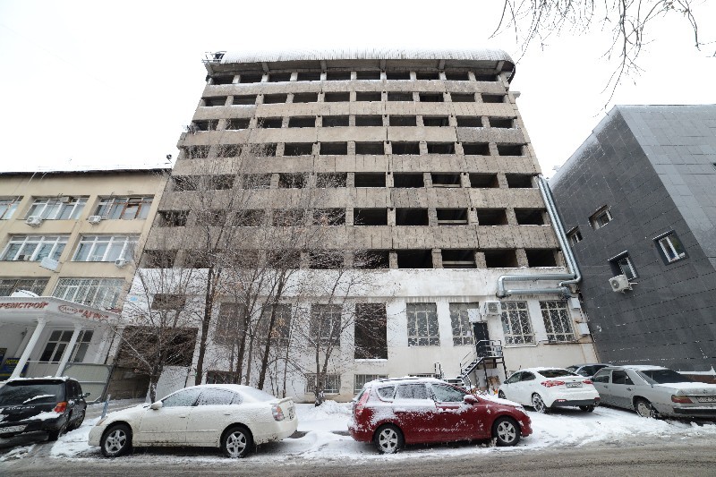 Впрочем, совсем уж заброшенным это здание назвать нельзя: на первом этаже, по словам курившего на крыльце охранника, находятся технические помещения ресторана “Шашлыков”. А вот выше нет ничего - только черные дыры оконных проемов. По информации управления земельных отношений Алматы, участок, на котором он расположен, принадлежит АО “Алматыгорремстрой” и предназначен для эксплуатации и обслуживания административно-производственного здания.