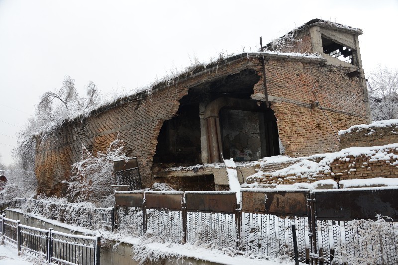 Красивое даже без реставрации здание, горячо любимое алматинскими фотографами, ныне стыдливо прикрыто баннером. Внутри впору снимать фильмы ужасов или постапокалиптическую фантастику: ободранные стены и потолки, заваленный мусором пол, разрушающиеся ступеньки плюс темнота даже в яркий солнечный день, странные звуки и жуткий холод. Даже удивительно, что с этим зданием не связаны какие-нибудь городские легенды, которые рассказывают про подобные объекты. Известно, что тут когда-то располагалось учебное заведение, однако более точной информации найти не удалось - у городского акимата данных об этом объекте нет.