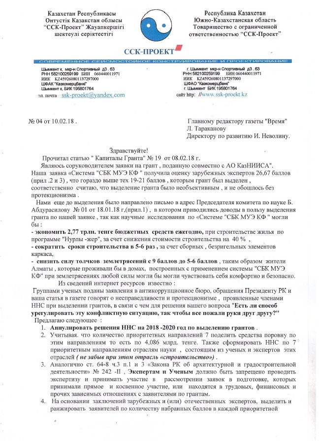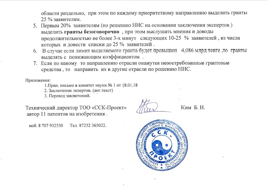 Борис Николаевич , столкнувшись с тем, что зарубежные эксперты необъективно занизили балл его проекту только из-за их незнания реальной ситуации в Казахстане, предложил свои семь пунктов по изменению ситуации с распределением грантов.