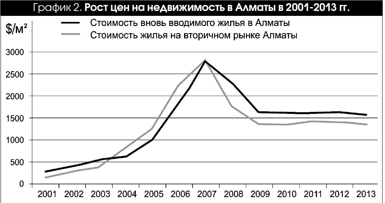 Вспомним 2001 год: президентская вертикаль создана, экономика приватизирована, “Казахстан-2030” в действии, мировой и российский кризис 1997-1998 годов позади, цены на нефть и металлы начали разгон в тучные годы. Возьмем его за базу цен на рынке жилья.