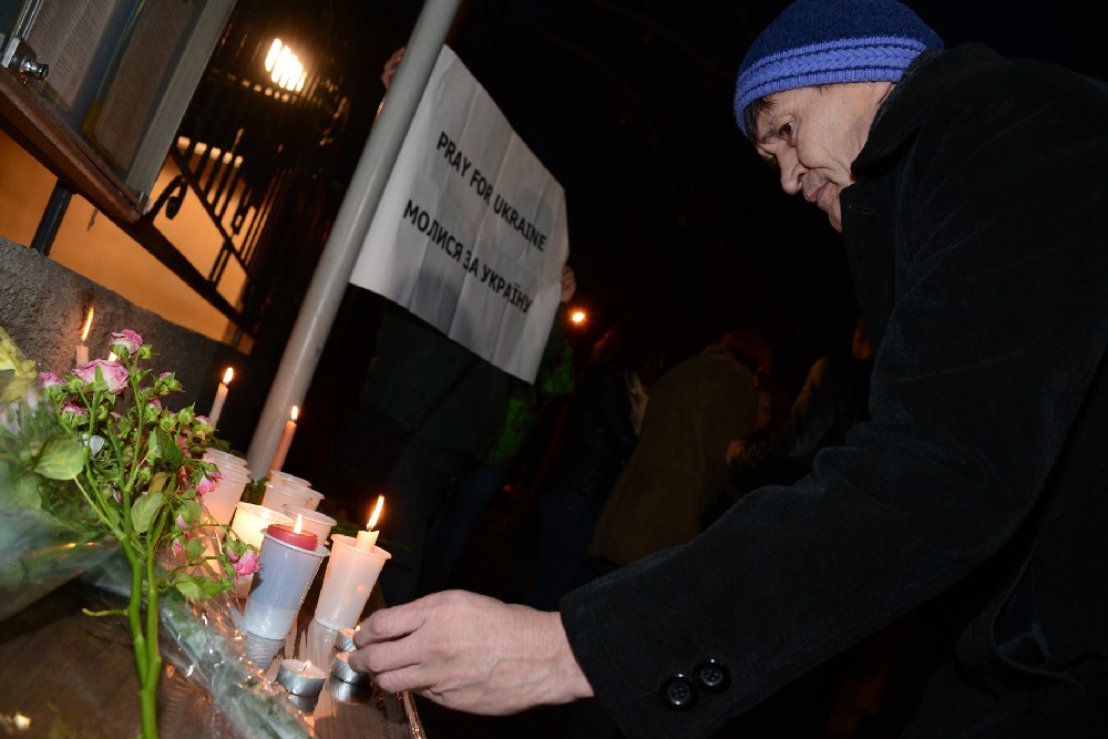 Неравнодушные алматинцы принесли с собой цветы и зажгли у ворот консульства десятки свечей. Кроме того, они развернули украинские флаги и хором спели государственный гимн Незалежной.