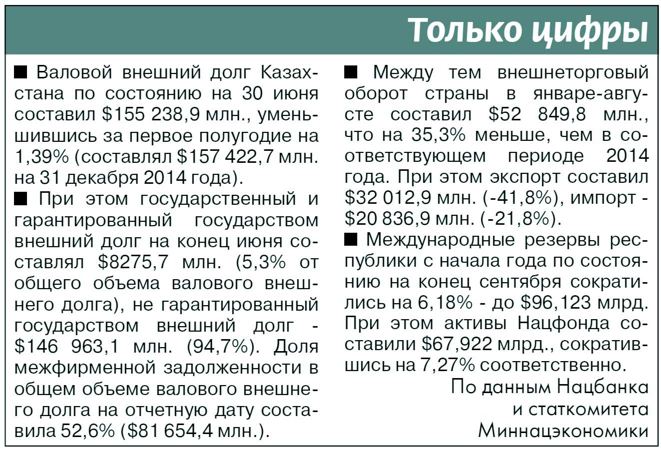 - Это долг, скорее всего, частного сектора, - предполагает наш эксперт. - Как правило, международные корпорации используют поддержку головных компаний в крупных проектах, например, в таких, как Кашаган, отсюда этот долг и возник. У Казахстана, увы, пока нет такой компетенции, чтобы реализовывать сложные технологические проекты, поэтому приходится привлекать высокооплачиваемых зарубежных консультантов.