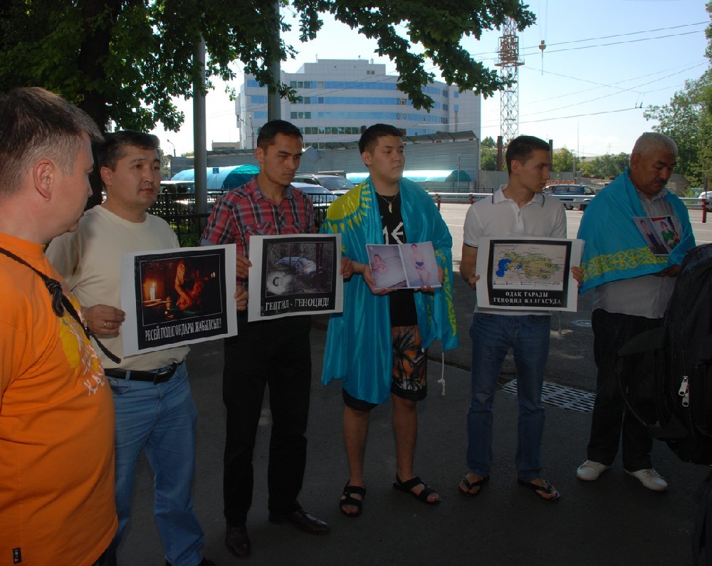 В руках ее участники держали казахстанский флаг, плакаты с надписями “Гептил - геноцид” и “Закройте российские полигоны” и фотографии детей и взрослых с различными врожденными аномалиями. Как пояснили активисты, на этих снимках изображены жители Западного Казахстана, пострадавшие из-за испытаний на полигоне Капустин Яр. Кроме того, они подготовили обращение к российским и казахстанским властям с требованием закрыть все российские полигоны на территории нашей страны.